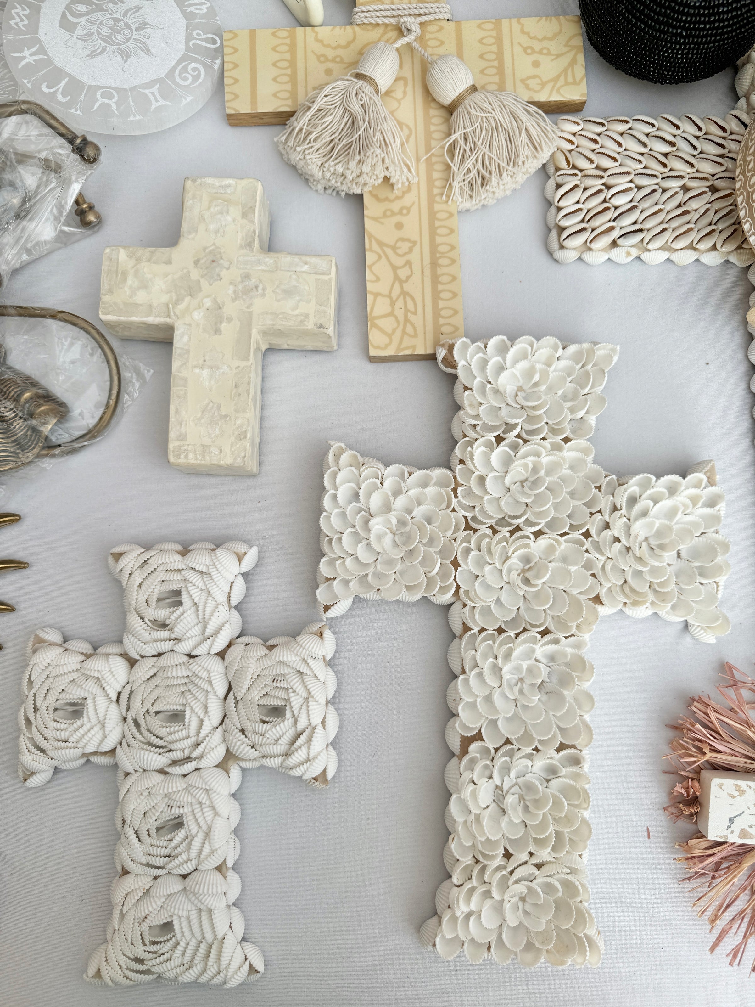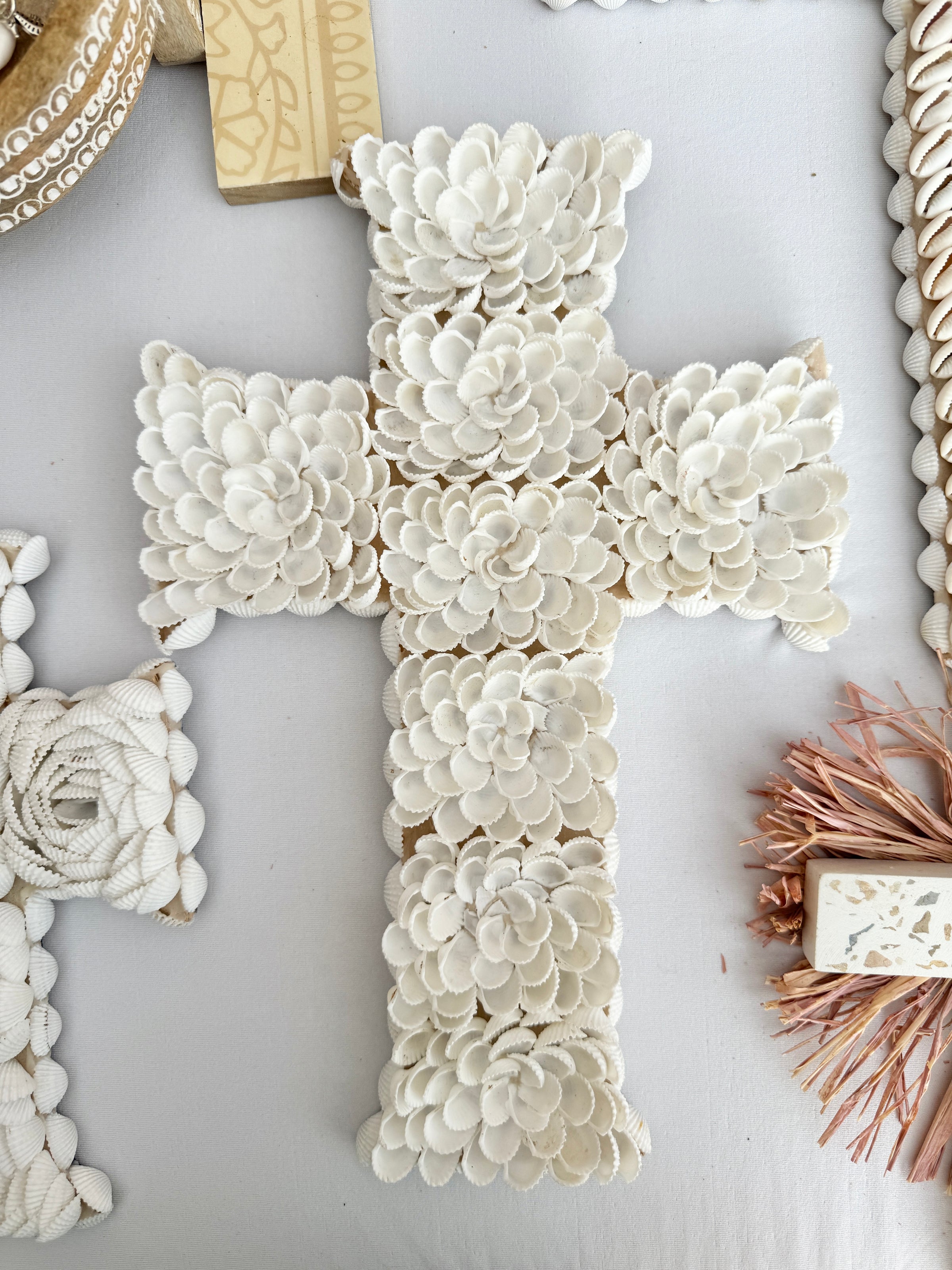 Gorgeous hand made shell cross ready to be hung on your wall or lean on top of a piece of furniture. These look great down a hall, in the bathroom or kitchen with a collection of 3 or 4 of our other small crosses, mirrors, tiles or plaques you can find on our website.