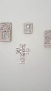 Gorgeous hand made shell cross ready to be hung on your wall or lean on top of a piece of furniture. These look great down a hall, in the bathroom or kitchen with a collection of 3 or 4 of our other small crosses, mirrors, tiles or plaques you can find on our website.