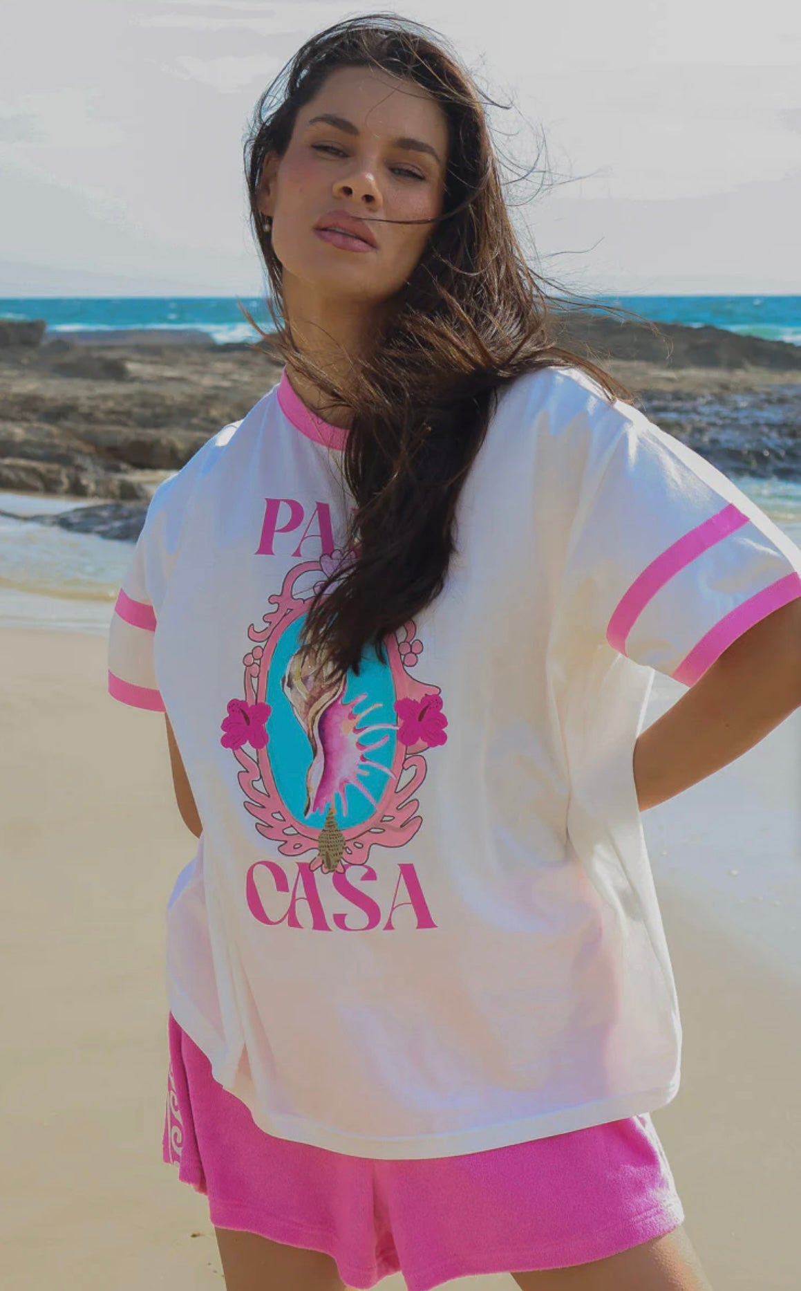 The new Terry shorts in pink are made from terry towelling fabric in a low waist style that features an elastic waistband with logo, and fake fly. The shorts are a relaxed style, with a wave cotton trim on the sides. Style it with our matching Clam Casa T-shirt to create the perfect comfy set. Exclusively by Palm Collective.