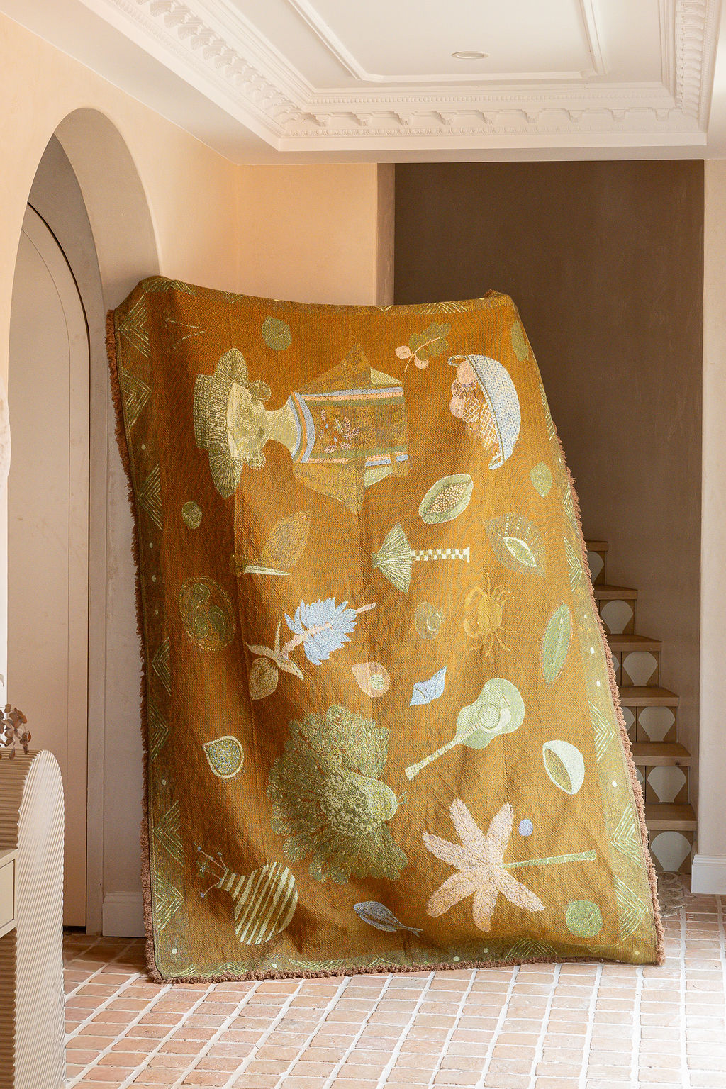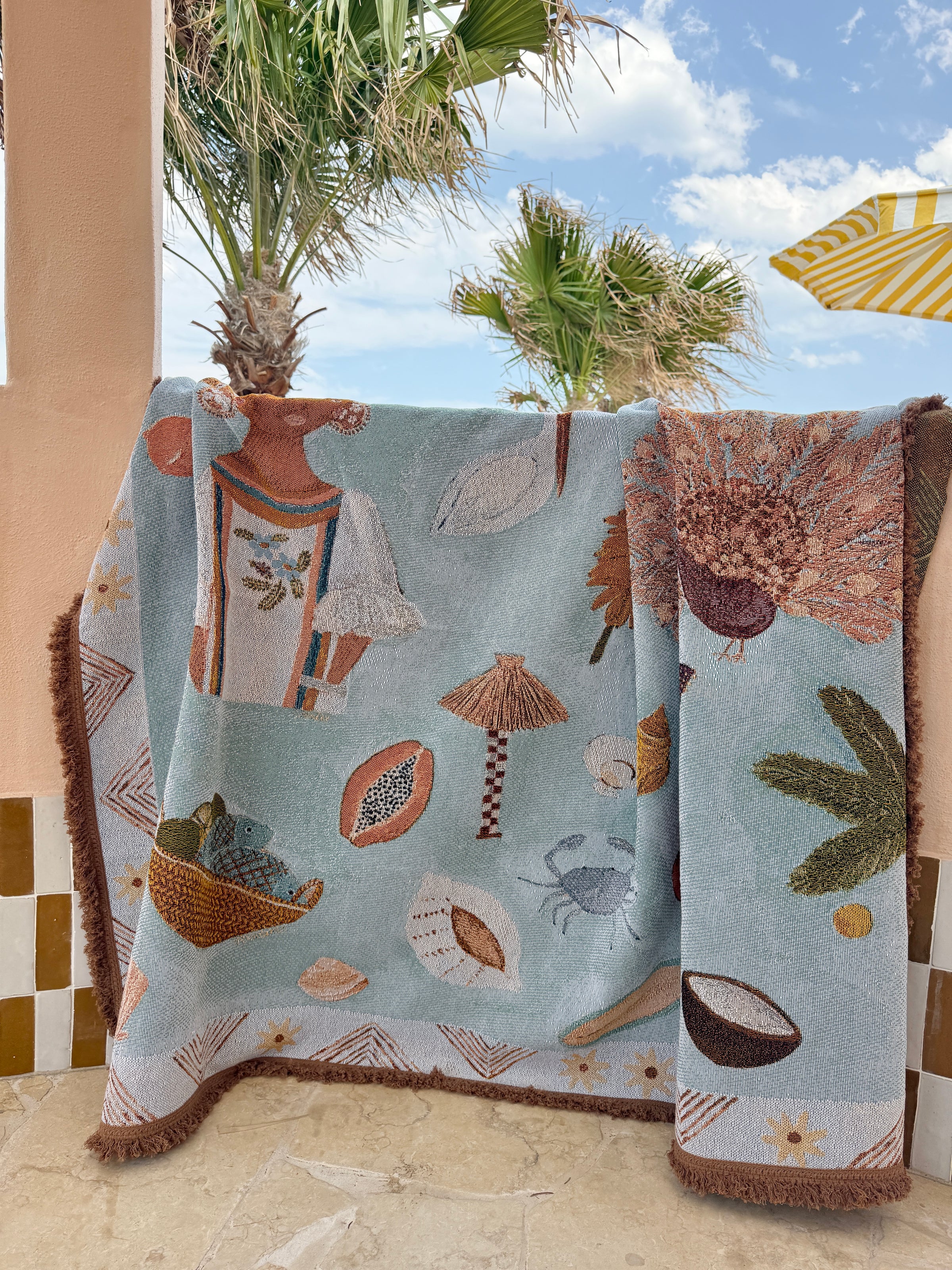 The art behind this throw began with Gabrielle’s dreamy original, “Summer Lovin’.” To bring it to life as a rectangular throw, we weaved in the elegant peacock and soulful guitar from another of her masterpieces, “Prosperity.” The result — a piece that feels like sunshine, music, and pure creative joy.