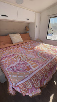 There’s so many uses for these stunning throws ~ They can be used as a picnic rug down the beach or park for the whole family to sit on, as a bed throw for extra warmth or to decorate or change the colour way of your bed, a lounge throw to add texture, vibrancy or warmth, a beach towel to dry yourself with after a swim in the ocean, a blanket to snuggle up in around a fire or to watch a movie, a wall hanger to display as beautiful Indigenous tapestry & more.